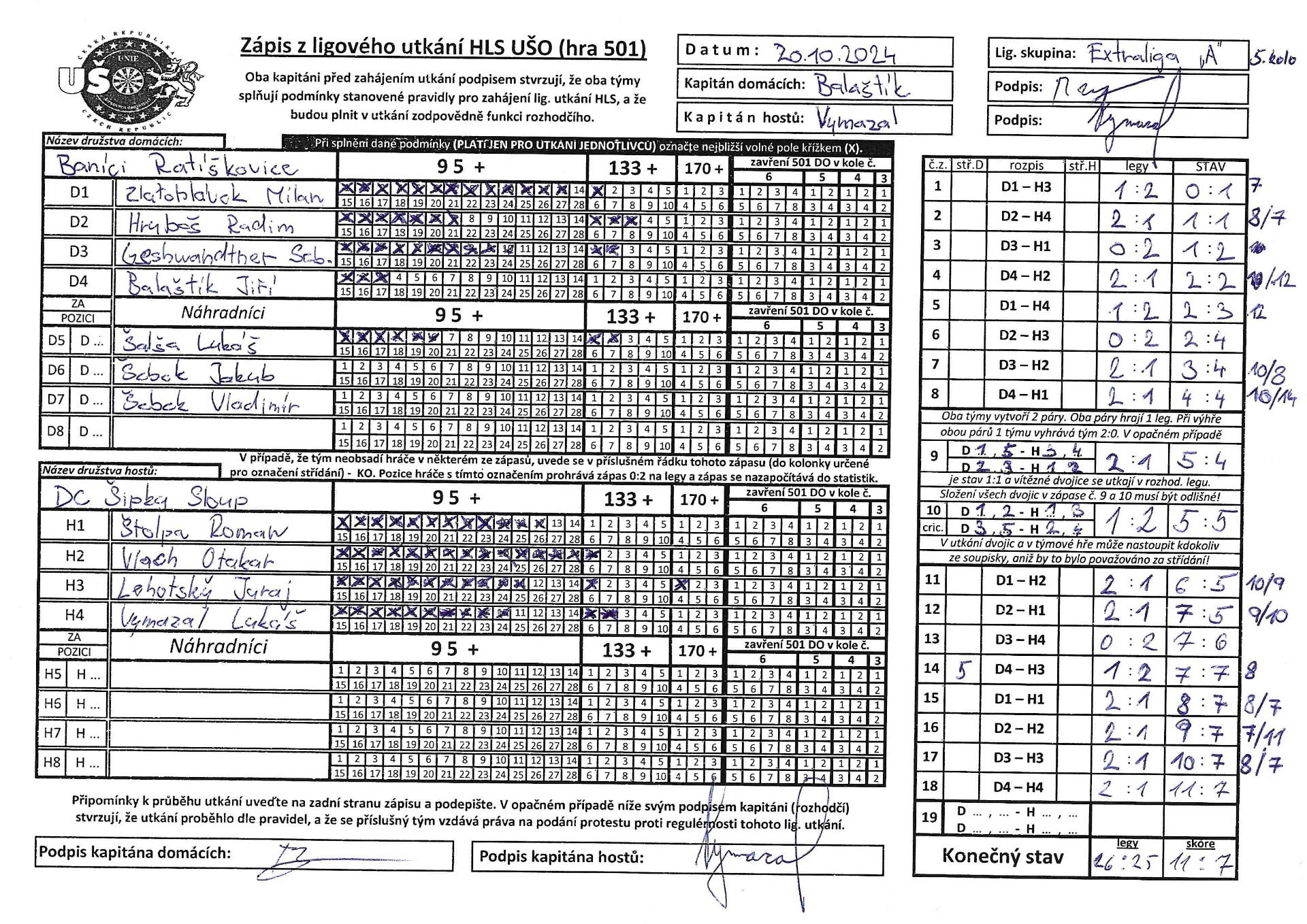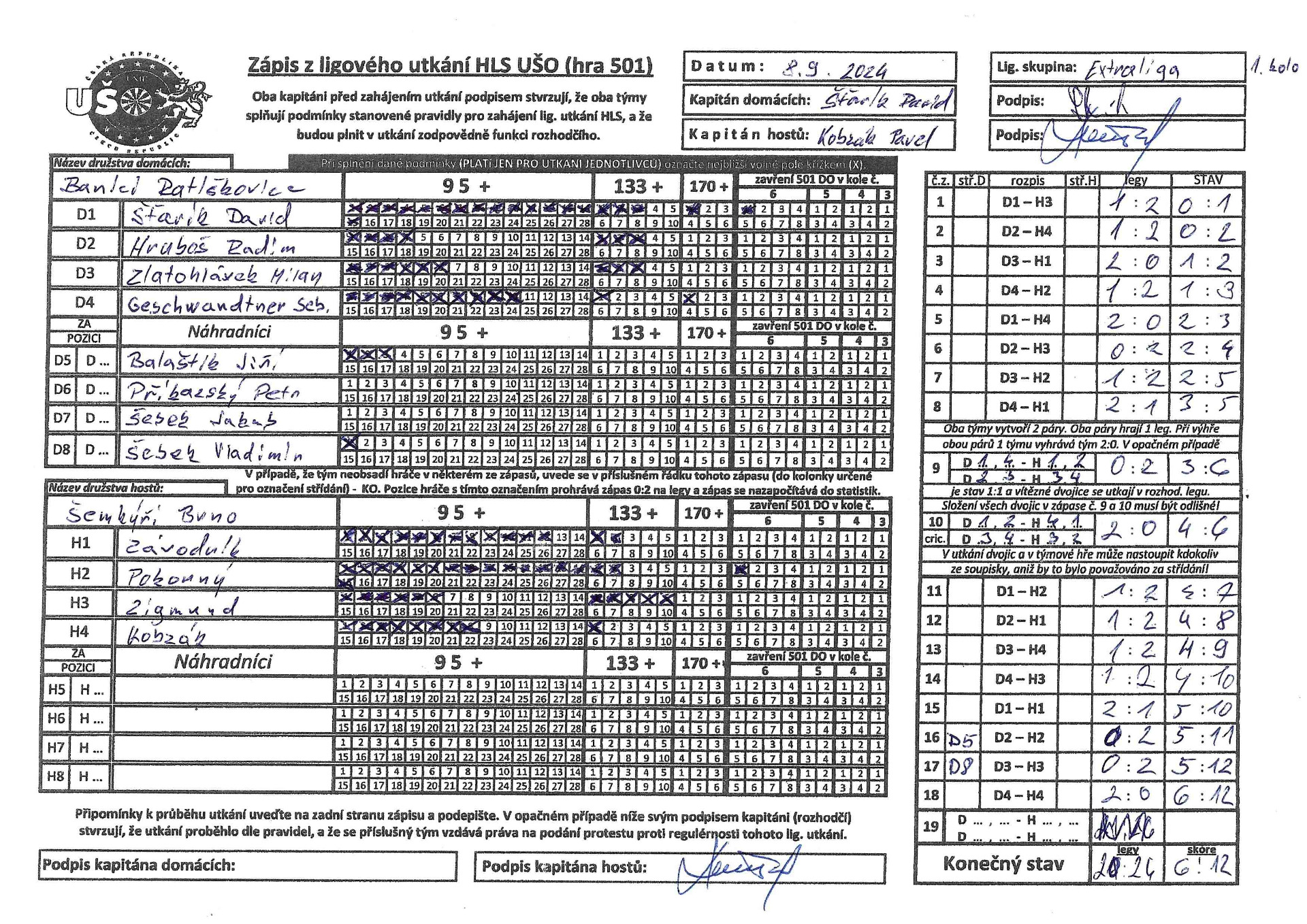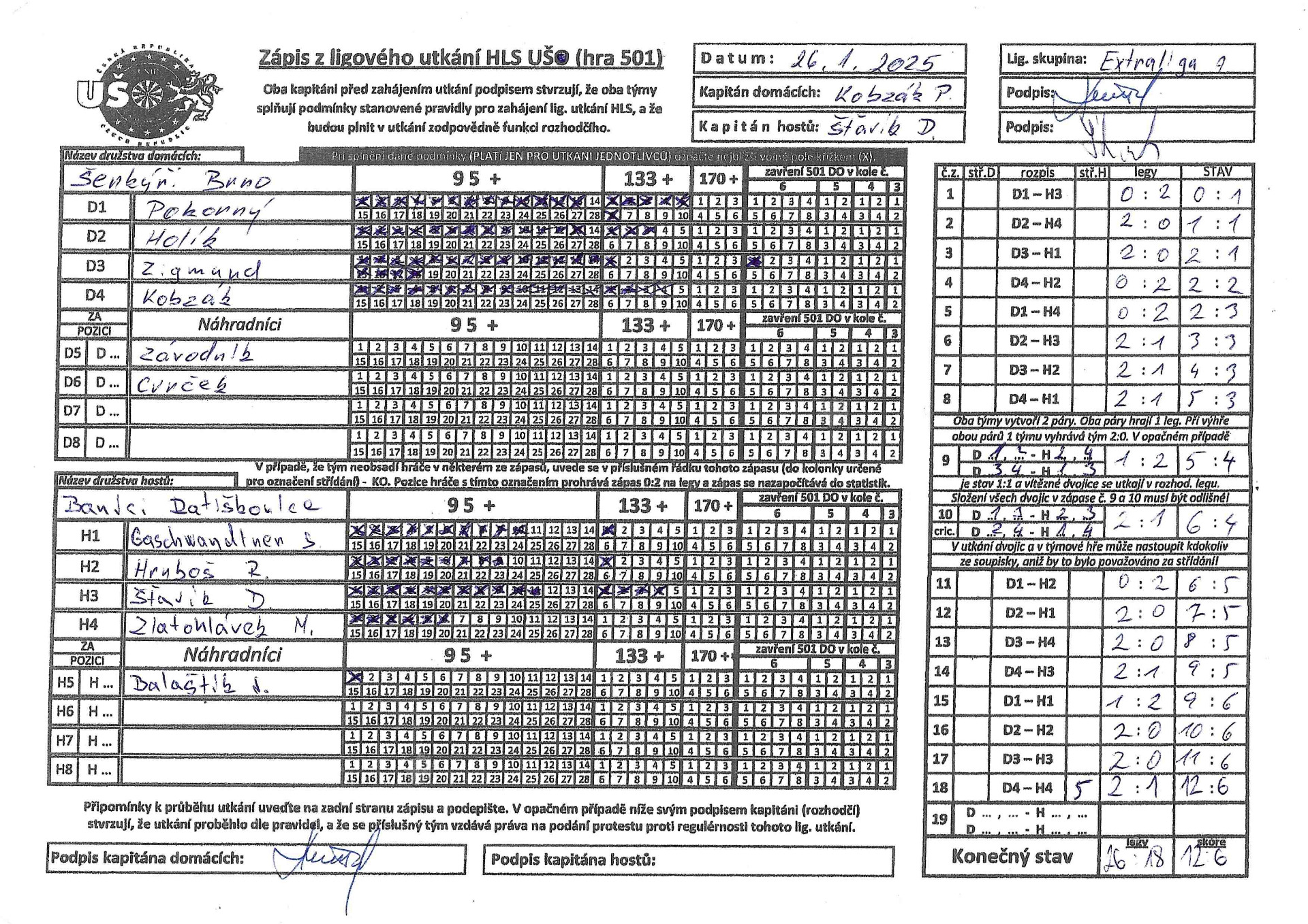 V nedělí 26.1.2025 jsme zajížděli k favoritovi celé Extraligy a to na tým Šenkýři Brno. V plné síle, odhodlání předvést to nejlepší co umíme. Bohužel opak se stal pravdou a dneska jsme si snad vybrali všechny špatné šipky na celou sezónu. Výkon celého týmu by se dal ohodnotit známkou 4. Nikdo z týmu nepředvedl svých 100%. prostě a jednoduše to dneska nešlo, asi to tak mělo být a snad si z toho vezmeme ponaučení do dalších zápasů. Výsledek mluví za vše. tak jako na podzim jsme se Šenkýřema prohráli 12:6. Nejlepší hráč za náš tým byl zvolen Radim Hruboš, jelikož přispěl dvěma body k celkovému výsledku.Hlavu vzhůru a už se soustředit na další zápas.