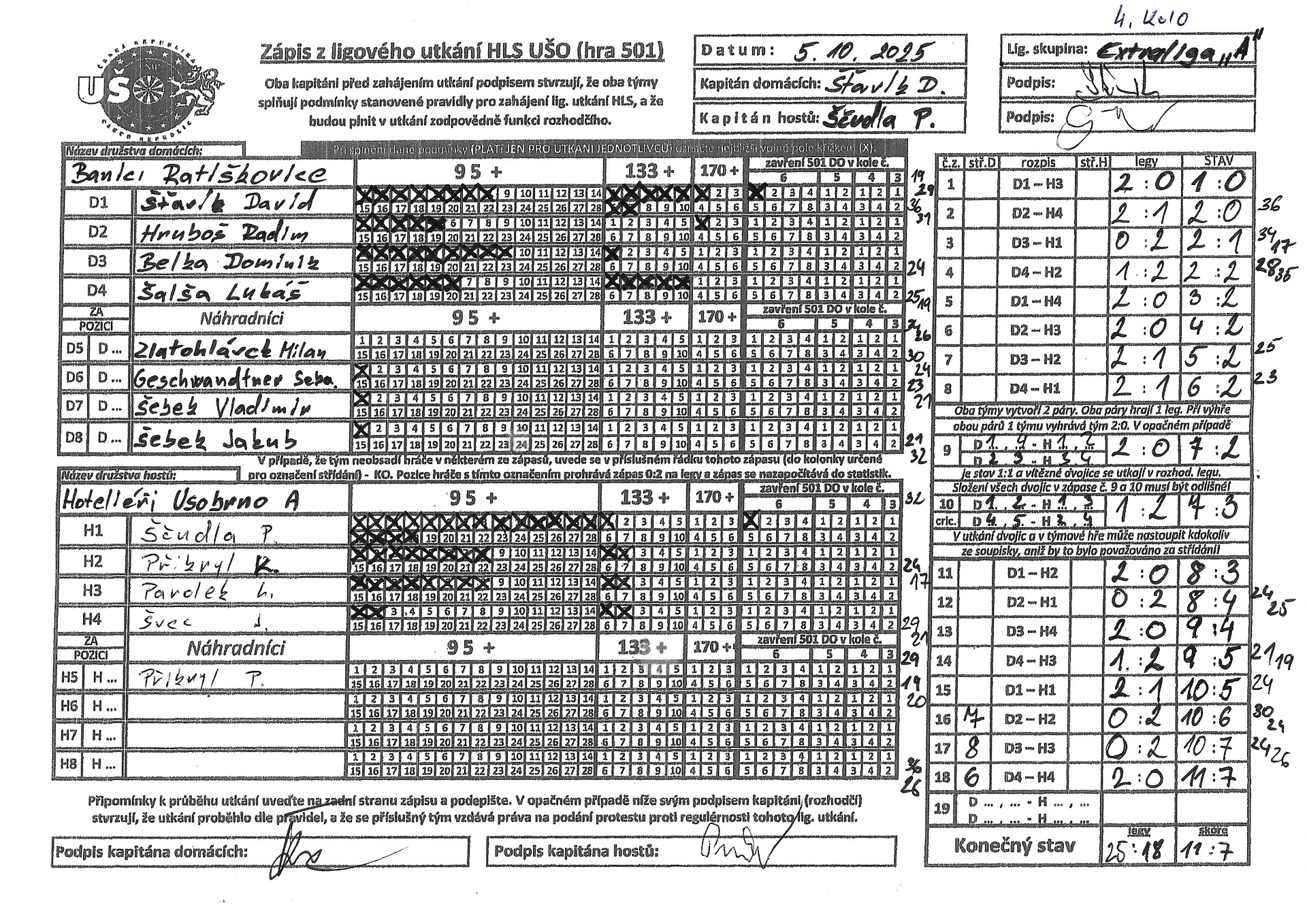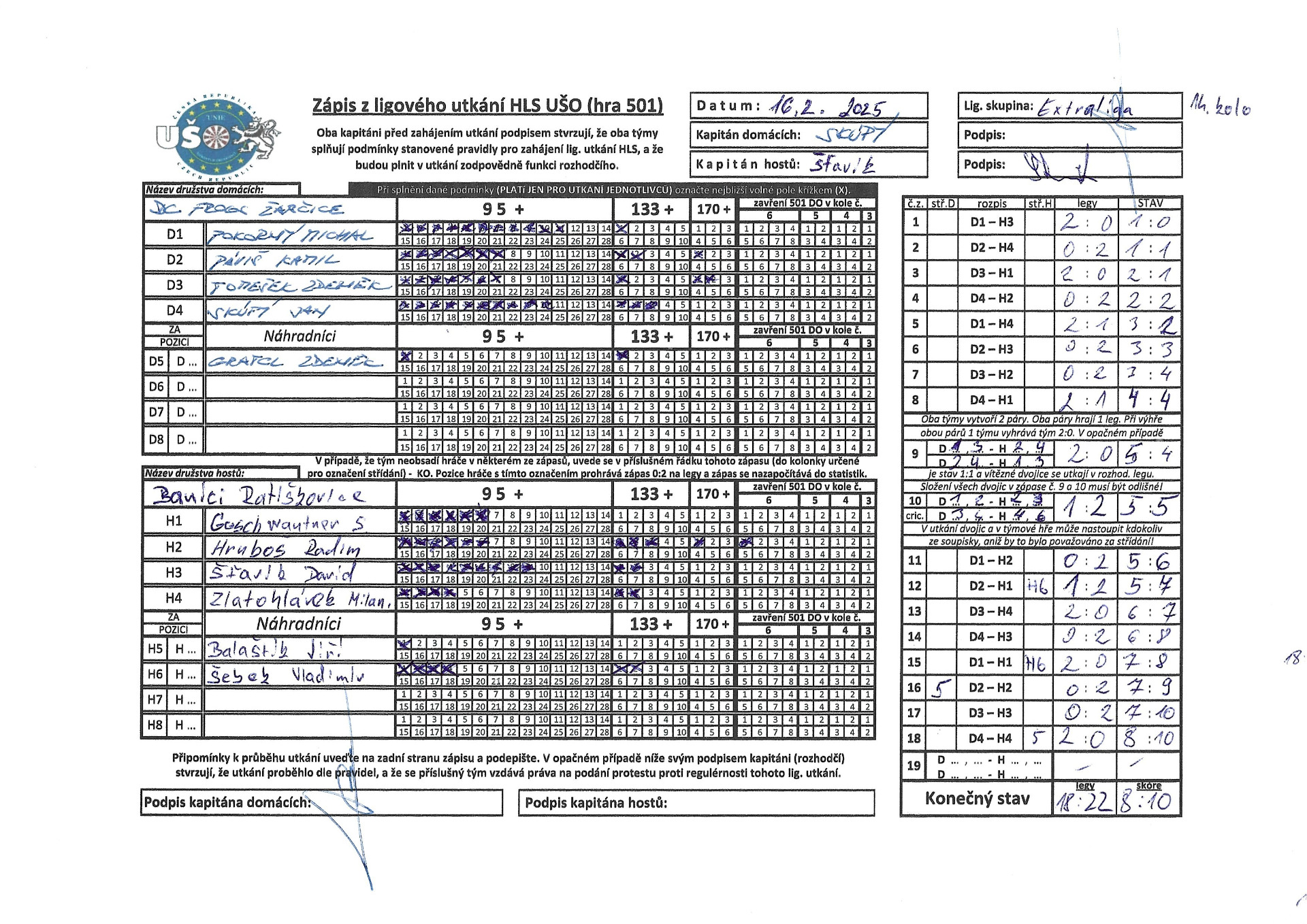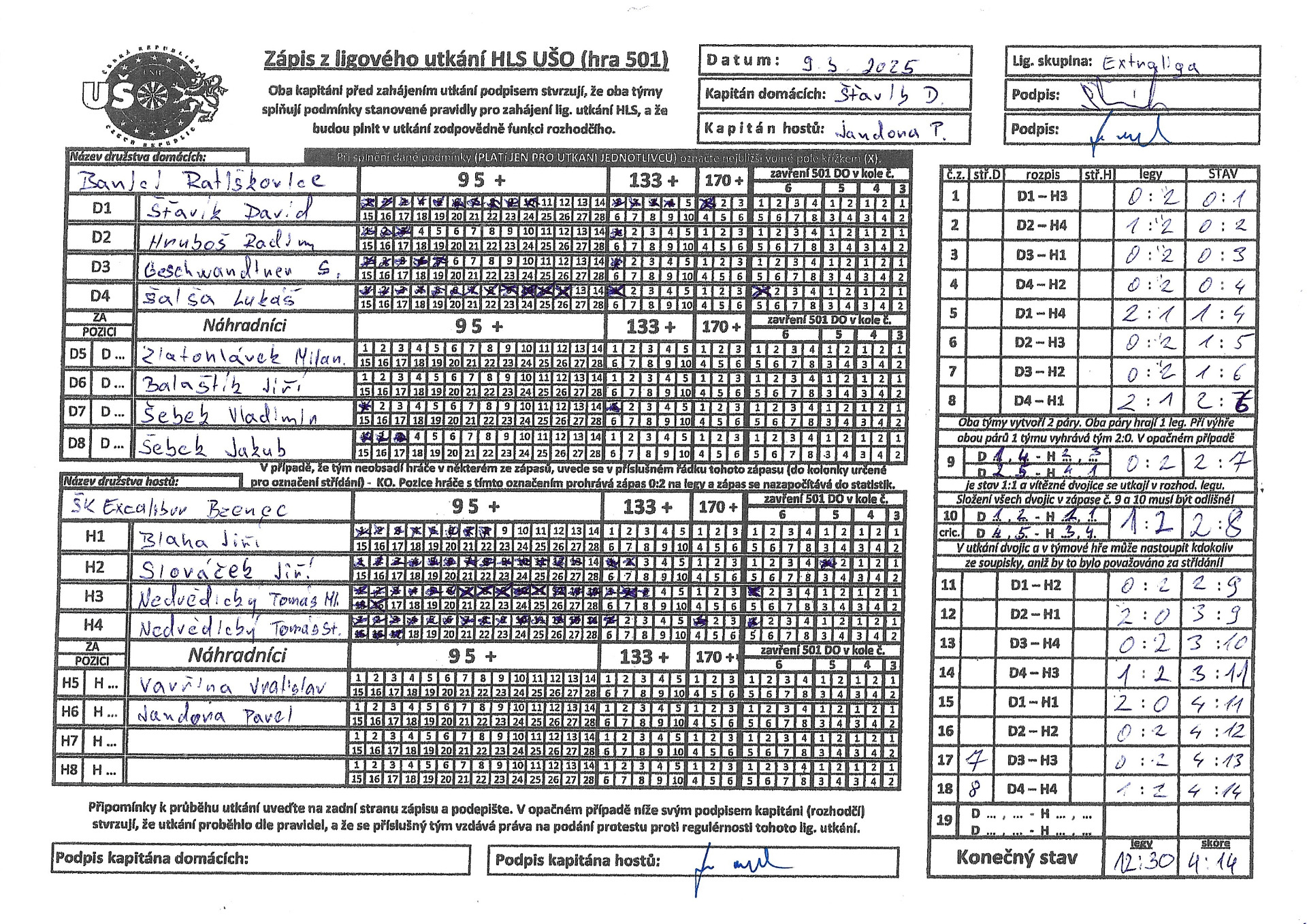 V nedělí 26.1.2025 jsme zajížděli k favoritovi celé Extraligy a to na tým Šenkýři Brno. V plné síle, odhodlání předvést to nejlepší co umíme. Bohužel opak se stal pravdou a dneska jsme si snad vybrali všechny špatné šipky na celou sezónu. Výkon celého týmu by se dal ohodnotit známkou 4. Nikdo z týmu nepředvedl svých 100%. prostě a jednoduše to dneska nešlo, asi to tak mělo být a snad si z toho vezmeme ponaučení do dalších zápasů. Výsledek mluví za vše. tak jako na podzim jsme se Šenkýřema prohráli 12:6. Nejlepší hráč za náš tým byl zvolen Radim Hruboš, jelikož přispěl dvěma body k celkovému výsledku.Hlavu vzhůru a už se soustředit na další zápas.