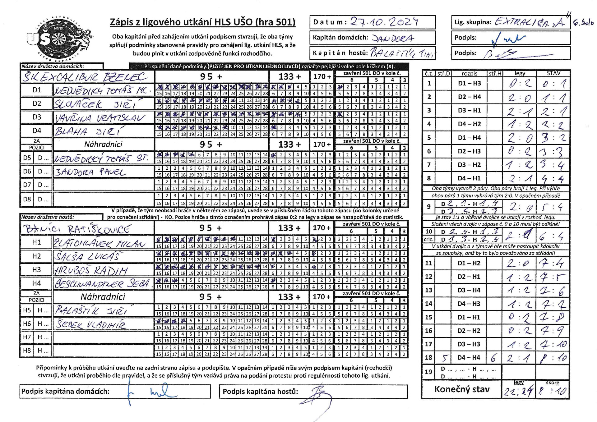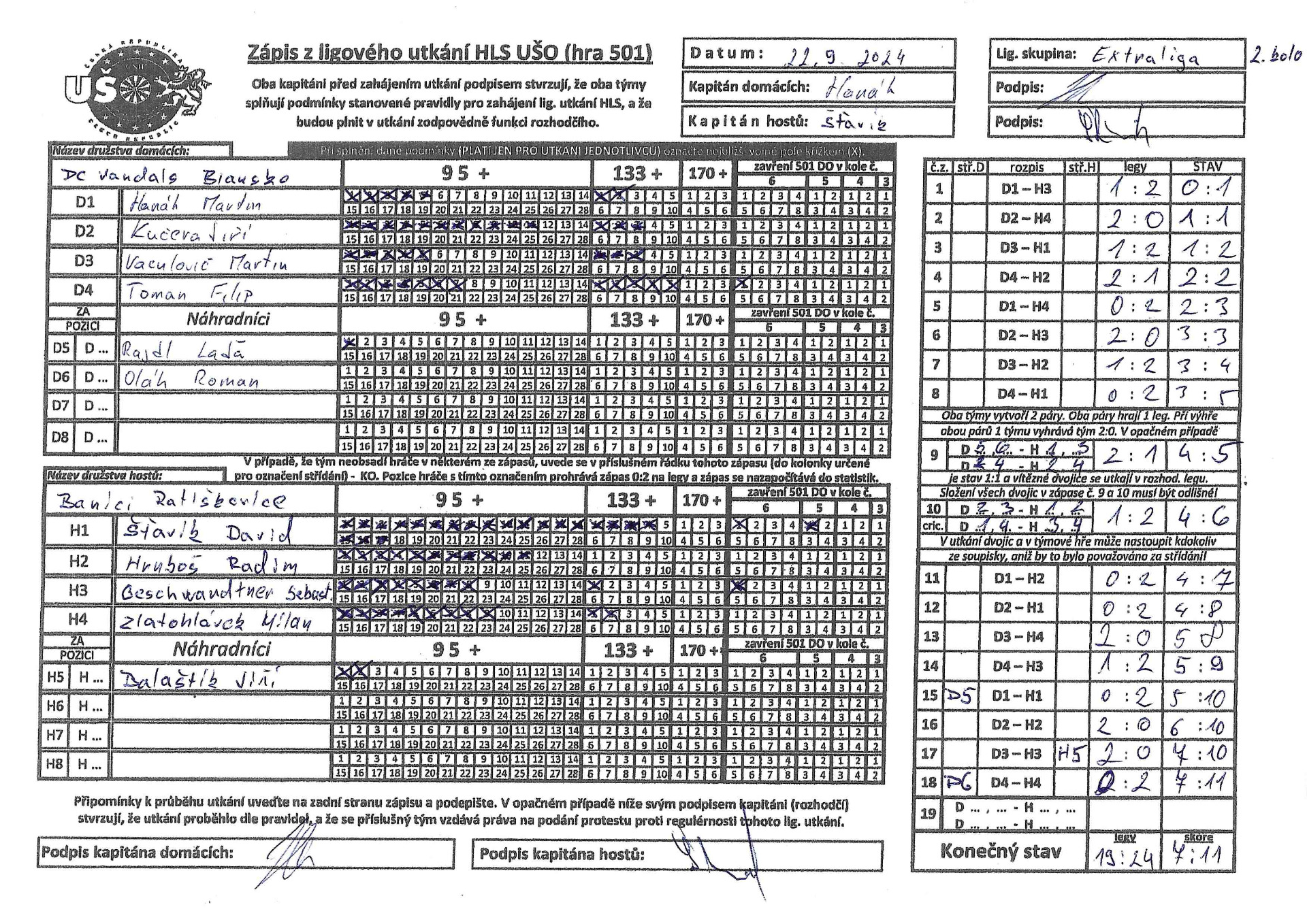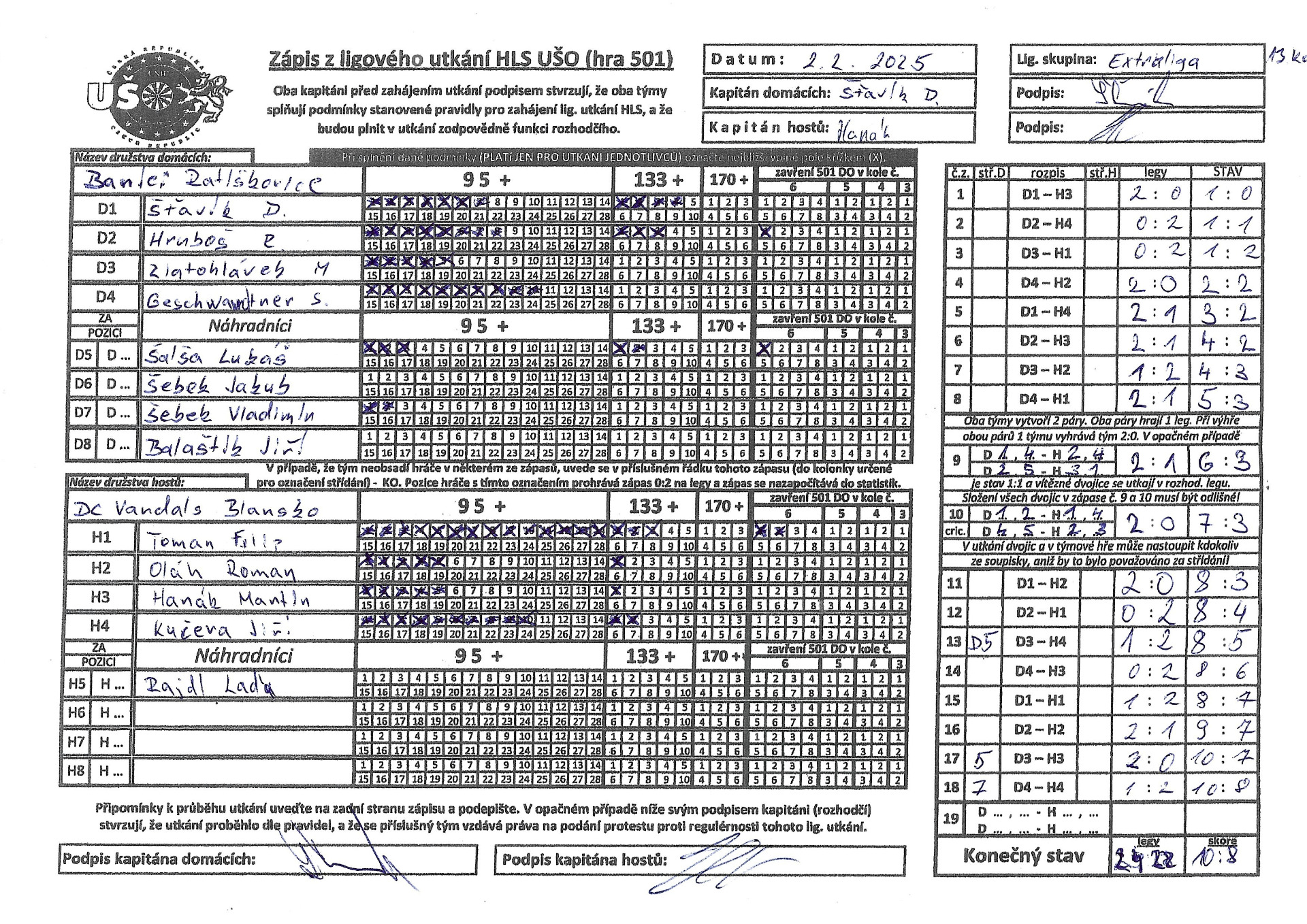 Odehrálo se 13. kolo Extraligy A. V domácím prostředí jsme přivítali tým DC Vandals Blansko. Ačkoli začátek zápasu vypadal že to bude hladká výhra kdy jsme po 11 zápasech vedli 8:3, tak opak byl pravdou a soupeř utkání dokázal zdramatizovat. Čím si vysvětlujeme zdramatizování utkání nevíme, podcenění soupeře, nervozita, lehkovážnost ale taky i soupeř začal hrát o dost lépe. Nakonec je z toho důležitá vydřená výhra 10:8. Hráčem zápasu vyhlášen kapitán David Šťavík, který přispěl 3 body ze svých zápasů a taky s Radimem Hrubošem předvedli perfektní cricket.Co nás ale moc těší je dnešní přízeň fanoušků. Bylo jich dnes opravdu hodně, až jsme se málem nevešli do hrací místnosti. Překvapením byla účast téměř všech hráčů z Excalibur Bzenec, jelikož jejich soupeř pro nemoc musel zápas odložit, tak nás přijeli podpořit. Všem fanouškům moc děkujeme za podporu.