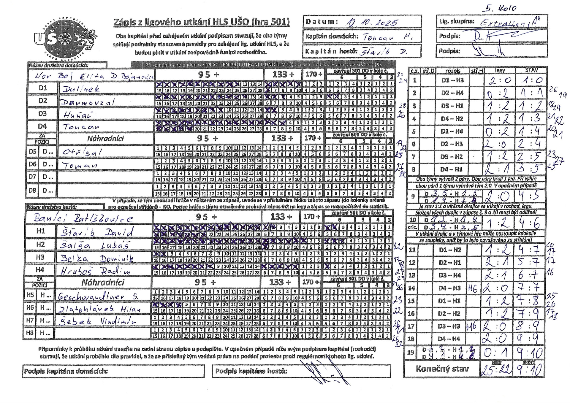 V pátém Extraligovém zápase jsme zajížděli k našim kamarádům do Horních Bojanovic. S klukama jsme dobří kamarádi takže jsme věděli že bude mít zápas super atmosféru a bylo tomu tak. Jak to nazvali kluci z H. Bojanovic: REKLAMA NA ŠIPKY. Hned ze začátku zápasu šla vidět kvalita obou týmů. Mnohdy rozhodovala jedna šipka. Po prvních 8 zápasech jsme vedli 5:3 a měli jsme dobře nakročeno k dalším 3 bodům do tabulky. Byli by to hodně cenné a vybojované 3 body Soupeř má ale velké kvality a to taky postupem utkání předváděl. Za stavu 9:7 pro náš tým už chyběl pouze jeden bod abychom si připsali plný počet bodů. Kluci z Hor Boj Elita předvedli že jsou opravdu Elita a v utkání dokázali vyrovnat stav a ukazovali skvělé šipky, což jde vidět ve statistikách protože to se dohromady naházelo to je úplný nesmysl. Po vyrovnání utkání nás čekal tzv. Autobus a to je vždy nevyzpytatelné. Hraje se hra 701 Liga, což znamená že z každého týmu hrají 2 dvojice a každá má svůj displej, nemůžete zavřít doublem pokud máte větší součet obou displejů než soupeř. V tomto Autobusu jsme byli tím šťastnějším a podařilo se nám utkání v prodloužení vyhrát a tím si připsat jeden bod navíc. V utkání padlo dohromady náhozů:95+ = 100x133+ = 27x171+ = 1 xA kvalita týmů byla vyobrazena i na tom že bylo dohromady zavřeno 8x 6. kolo. Pánové před všema klobouček.Troufneme si říct že moc lepších zápasů v sezóně Extraligy A neuvidíme. Jak vyhodnotit nejlepšího hráče ? Celý tým si zaslouží veškerou chválu, ale nejlepším hráčem se zaslouženě stává:LUKÁŠ ŠALŠA.Lukáš neprohrál ani jeden svůj single zápas. Naházel 14x 95+, 6x 133+, 1x 180 a zavřel 3x 6. kolo. Lukášovi gratulujeme a doufáme že mu forma vydrží co nejdéle. Díky této výhře jsme se vyhoupli na 5. místo tabulky Extraligy A Jihomoravského Kraje. Chtěli bychom taky poděkovat klukům z DC Hor Boj Elita za skvěle přichystané zázemí, vynikající jídlo a super atmosféru ve vynikajícím kolektivu. Chlapci děkujeme a těšíme se na další setkání.