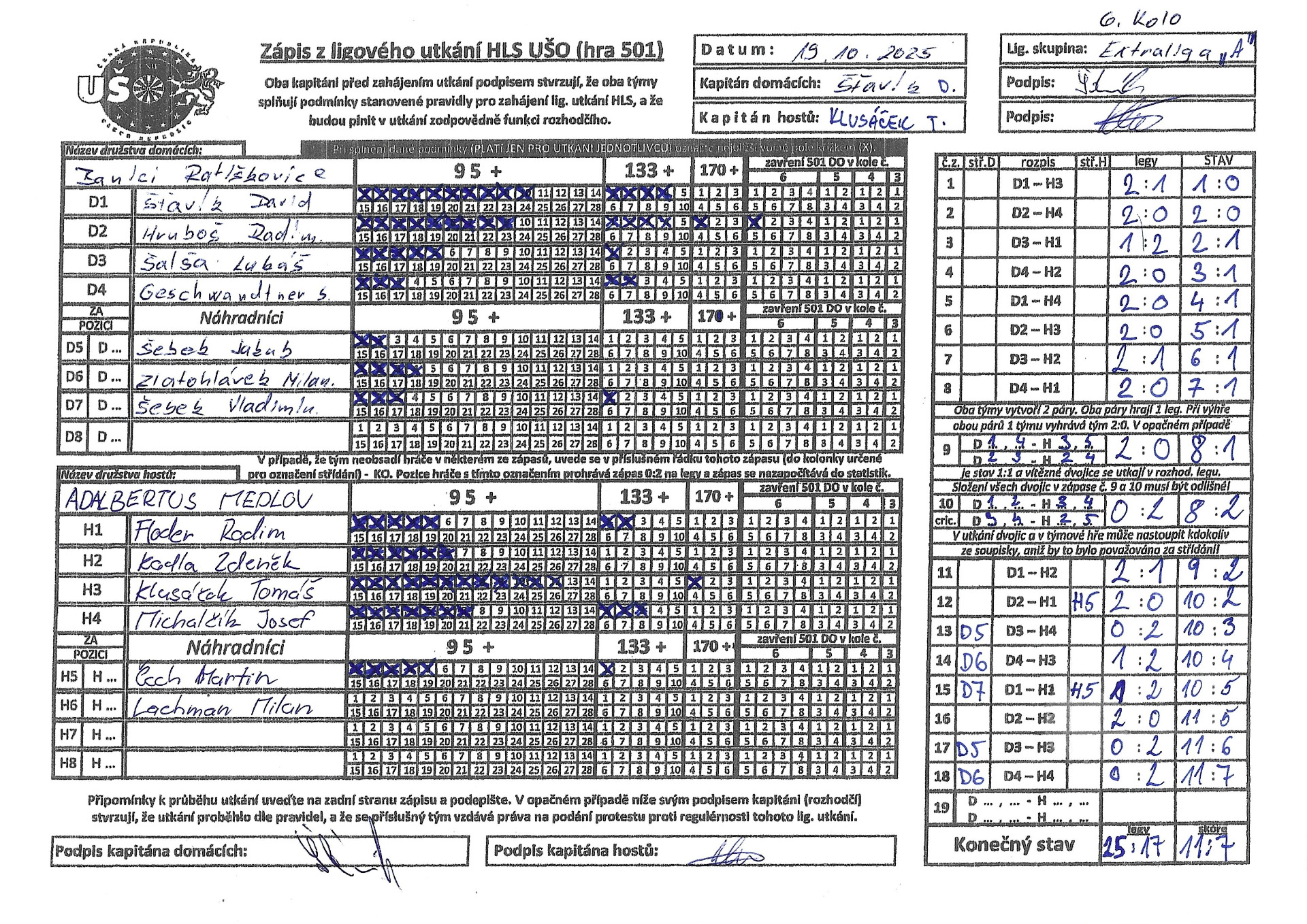 V 6. kole jsme se na domácí půdě utkali s týmem Adalbertus Medlov. Už od začátku zápasu jsem udávali tempo utkání, i když soupeř hrál dobré šipky. Po prvních 8 zápasech jsme vedli už 7:1 a tak panovala dobrá a klidná nálada v týmu. I když se říká nechval dne před večerem. Za tohoto stavu jsme šli do čtyř her. Tam se nám zadařilo na 50%. Tentokrát nám vyšla první čtyřhra a tak jsme připsali další bod na prozatímní scóre 8:1. Tentokrát nám nevyšle cricket a tak soupeř snížil stav v utkání na 8:2, ale věděli jsme že dva body už musíme urvat a zaspat si další důležité 3 body do tabulky, jelikož do dalších dvou zápasů nastupují momentálně nejlepší dva naši hráči a tak už náhradníci byli nachystaní a nažhavení na to se ukázat. David i Radim své utkání zvládli a tak přišel čas na naši ,,lavičku", protože když už je utkání rozhodnuto tak proč by si lavička nezahrála že Celkové scóre se nakonec zastavilo na čísle 11:7 v náš prospěch a tak slavíme další výhru a další 3 body do tabulky.Nejlepším hráčem se stal náš ,,Hraboš" RADIM HRUBOŠ. Který ze svých 4 zápasů neprohrál ani leg a zapsal si krásné scóre 8:0 a zavření 104 . Našemu kapitánovi se podařilo vyhoupnout zpět na první místo hodnocení všech hráčů. Davidovi gratulujeme a ať mu forma vydrží co nejdéle. Na tento zápas náš přišla podpořit i naše jedna z nejvěrnějších fanynek Nelinka Rychlíková. My jí moc děkujeme za podporu a snad nás bude podporovat i nadále. Samozřejmě nás přišly podpořit stálé opory jako Peťa Zemánek, čas si udělal i nový ,,béleš" a kapitán mnohých z nás z SD Hodonín Michal Šubín tak i mnoho dalších. Na streamu vás bylo taky hromada a my vám moc děkujeme za podporu.